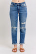 These premium denim boyfriend jeans feature a classic medium wash with modern distressed details. Made from high-quality cotton blend denim that offers both comfort and durability. The relaxed fit through hip and thigh creates a flattering silhouette, while the roll-up cuffs add versatility to the style. Strategic distressing at the knees adds an on-trend element. The mid-rise waist and traditional 5-pocket design maintain classic jean styling. Perfect for casual everyday wear and can be dressed up or down for various occasions.
