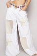 These stylish white wide leg pants feature a relaxed bohemian design with eye-catching mesh panel inserts and sparkling star rhinestone embellishments. Made from comfortable lightweight cotton blend fabric, they offer a flattering high-waist silhouette perfect for casual wear and festival fashion. The unique patchwork construction with sheer mesh details adds visual interest while maintaining breathability and comfort for all-day wear.