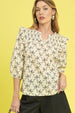 This elegant vintage-inspired blouse features a distinctive geometric print pattern with ruffle shoulder accents that add feminine charm. Crafted from lightweight chiffon material for comfortable all-day wear, it showcases a flattering V-neck design and three-quarter sleeves with elastic cuffs. The versatile styling makes it perfect for both casual and semi-formal occasions, while the soft drape and breathable fabric ensure comfort and elegance. The unique print pattern and ruffle details create a sophisticated yet playful look that stands out in any wardrobe.