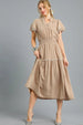 This elegant bohemian midi dress features a flattering V-neck with tie closure and beautifully embroidered short sleeves with decorative trim details. The elastic waistband creates a comfortable and flattering fit while the tiered ruffle hem adds feminine charm. Made from lightweight, breathable fabric in a versatile neutral beige tone, this A-line dress offers effortless style for casual outings, brunches, or vacation wear. The midi length provides modest coverage while maintaining a chic silhouette that pairs perfectly with sandals or heels.